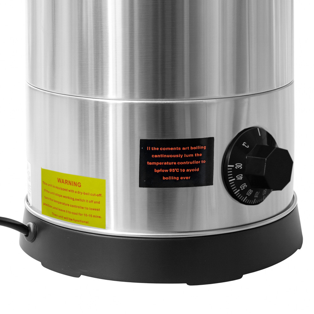 A 1500 W-os teljesítmény gyors felmelegedést biztosít, és gond nélkül képes nagy mennyiségű ital elkészítésére. A 20 literes űrtartalom ideálissá teszi olyan üzemeltetési helyek számára, ahol nagy a kereslet – például piacokon, rendezvényeken és egyéb gasztronómiai eseményeken. A forgó szabályozó segítségével a hőmérséklet 30 és 110 °C között egyszerűen beállítható, attól függően, hogy az italt csak melegen tartani vagy felforralni szükséges. A jelzőlámpa tájékoztat a beállított hőmérséklet eléréséről.