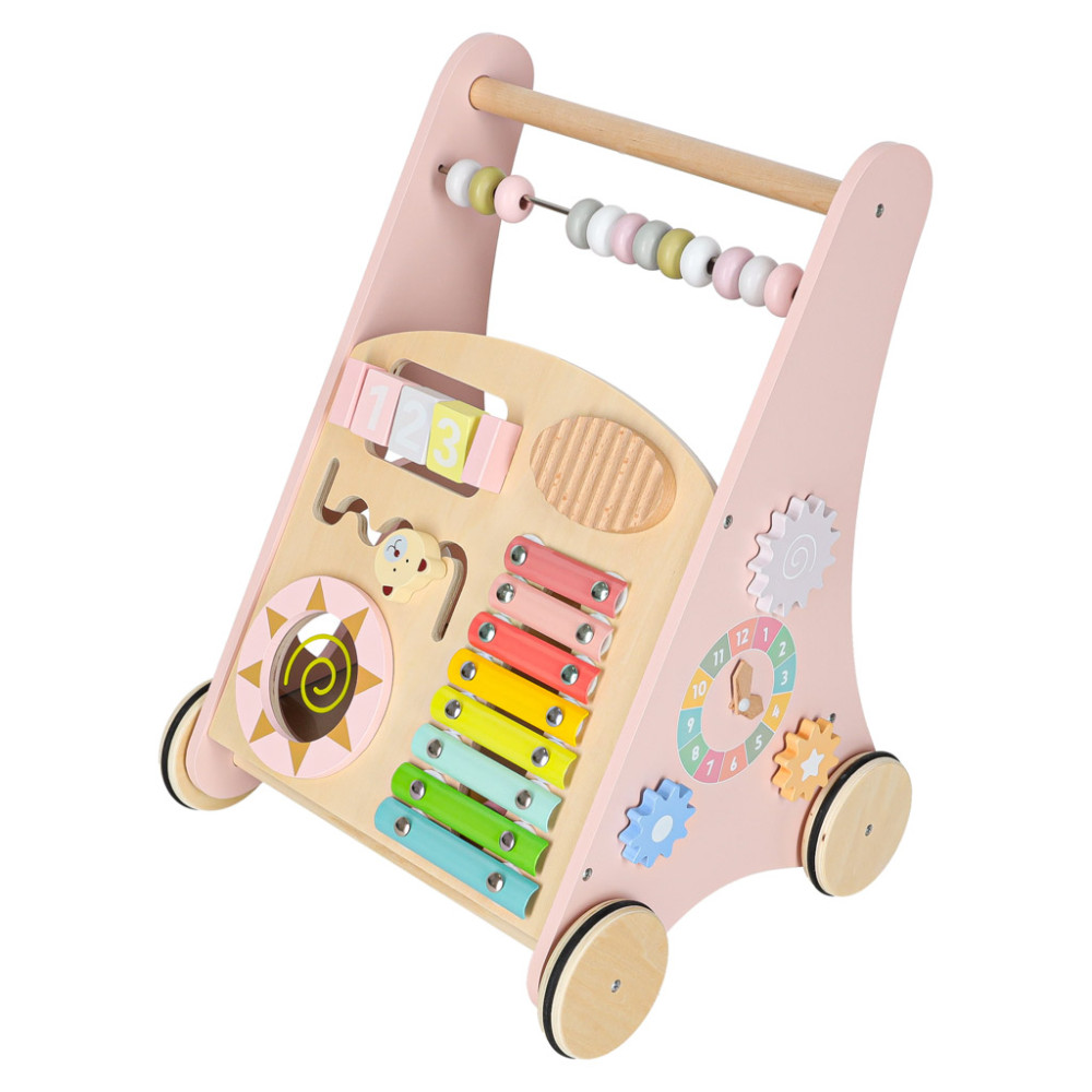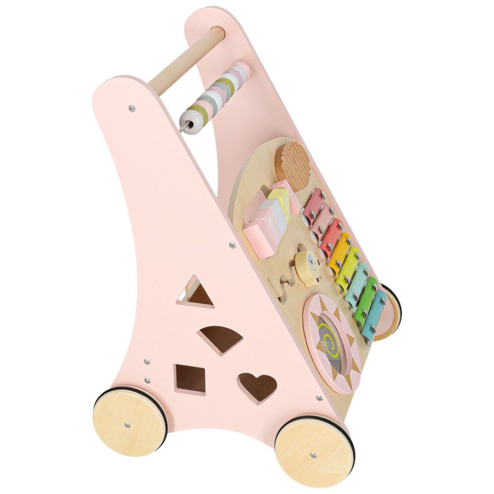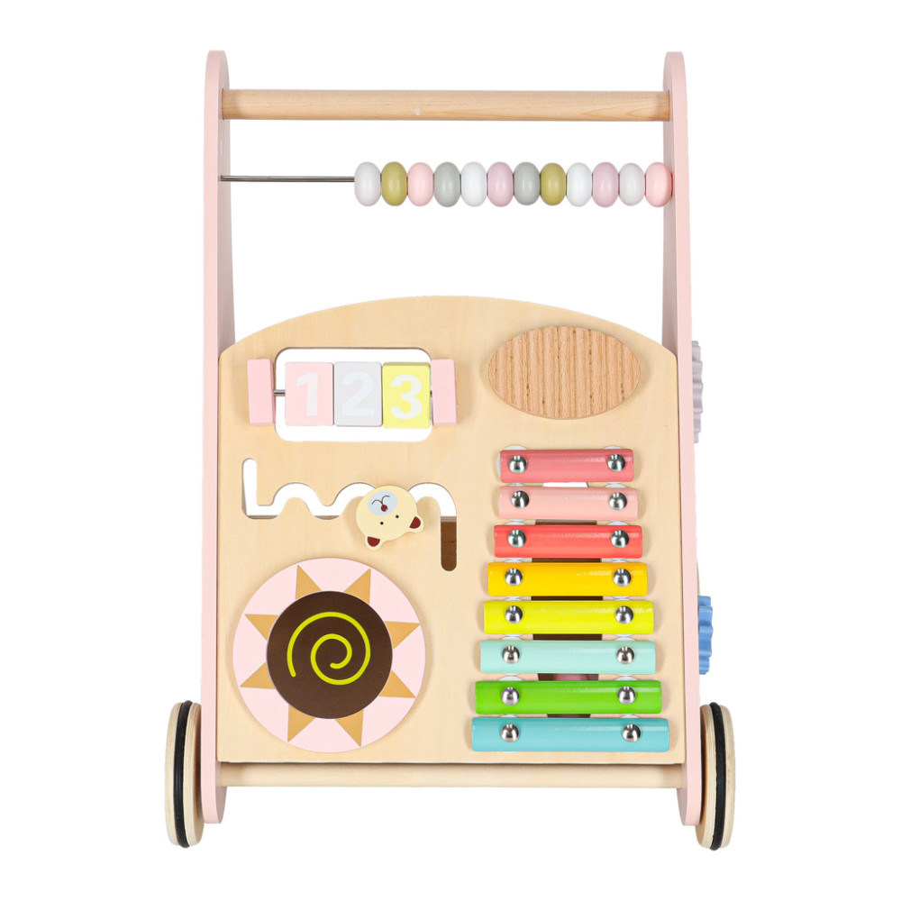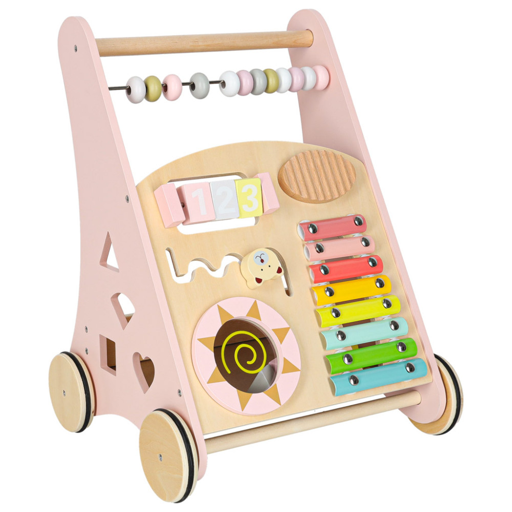 A fából készült oktató járássegítő egy multifunkcionális játék, amely segíti gyermekét a járás elsajátításában, valamint a szenzoros és kézügyességi készségek fejlesztésében. Természetes fából készült, biztonságos, vízbázisú festékkel festve pasztell színekben. A stabil szerkezet fa fogantyúval és négy kerékkel segíti a gyermeket az egyensúly megtartásában és az első lépések magabiztos megtételében.