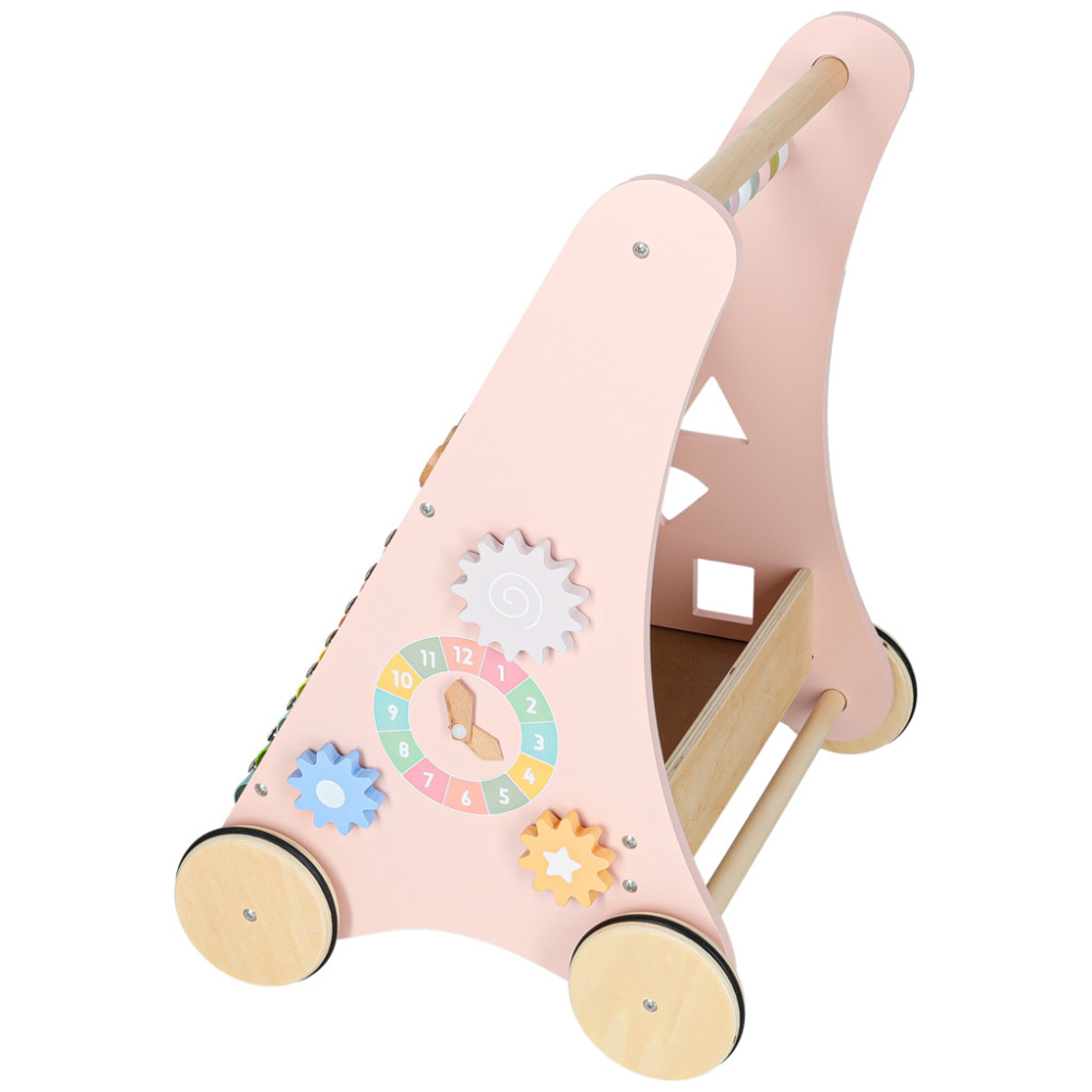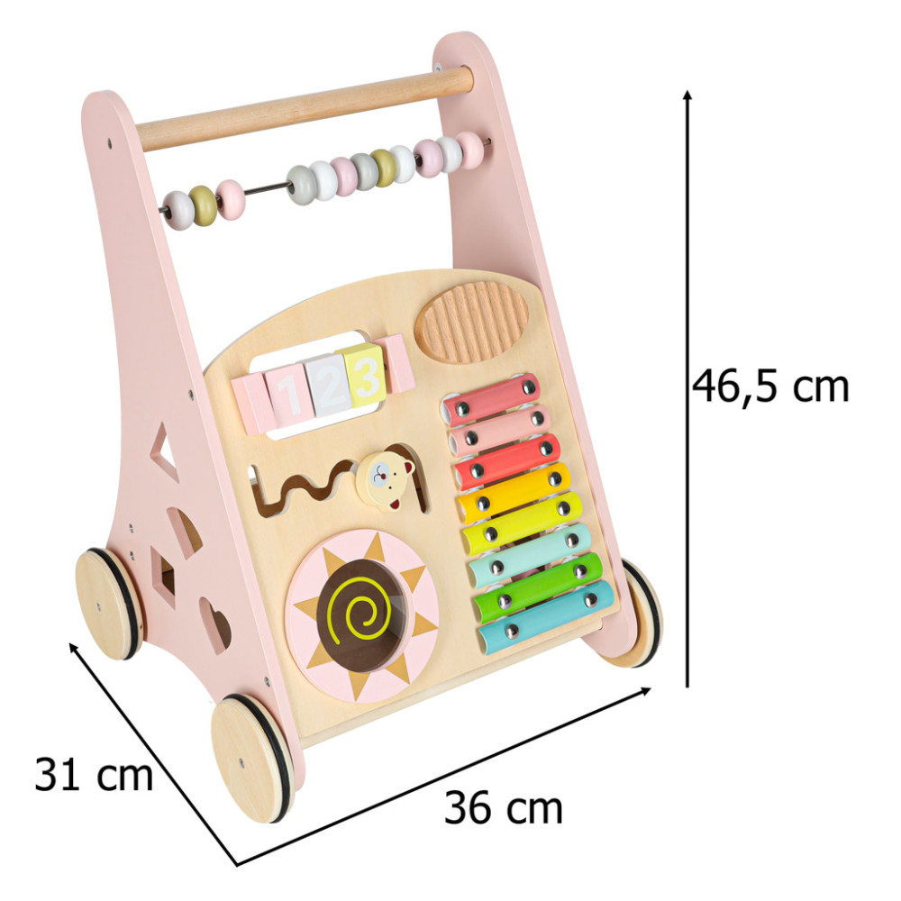 A fa sima felülete, lekerekített élei és stabil, gumírozott kerekekkel ellátott alja megakadályozzák a csúszást. A sokféle funkció változatosságot nyújt, így a játék egyszerre több készséget is fejleszt. A járássegítő ideális 12 hónapos kortól azoknak a gyerekeknek, akik éppen most kezdenek járni, és mozgáson, játékon keresztül fedezik fel a világot.