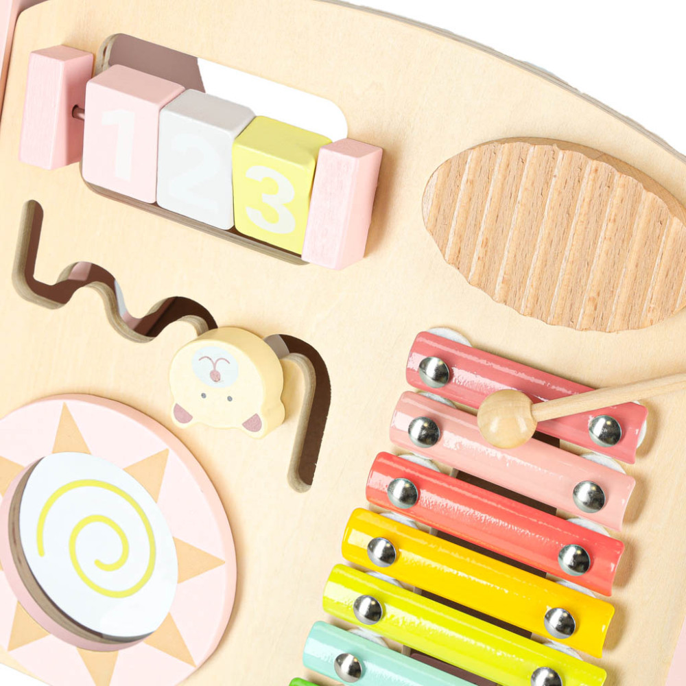 Számos mozgatható, forgatható és hangot adó elem fejleszti az ujjak ügyességét, a szem–kéz koordinációt és a mozdulatok pontosságát. A színes kockák, a cintányérok hangjai és a különböző textúrák ösztönzik a látást, a hallást és a tapintást. A játék formaválogatót is tartalmaz különböző alakú és színű kockákkal. Fejleszti a ritmusérzéket és a zenei hallást, a beépített cintányérokkal pedig a gyermek megalkothatja első dallamait. A színes gyöngyökkel ellátott számoló segít a számolás és a színek megismerésében.