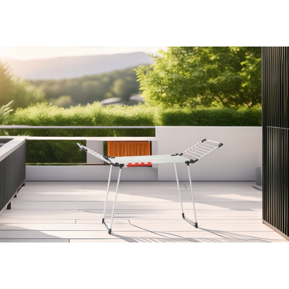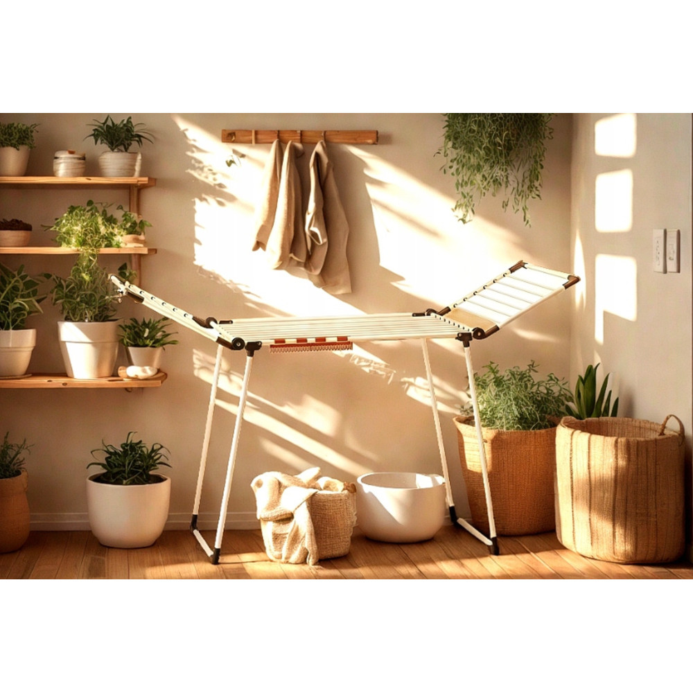 A Renata ruhaszárító tervezésekor az elsődleges szempont a mindennapi praktikum és a hosszú élettartam volt. Ez a modell ideális választás a modern háztartások számára, ahol fontos a nagy szárítási felület és a stabil, megbízható kialakítás. A tágas szárítófelület bőséges helyet biztosít a heti nagy mosásokhoz is; a szárnyak kinyitásával kényelmesen teregethetők rajta a hosszabb ruhadarabok, nadrágok vagy akár a nagyméretű törölközők is anélkül, hogy azok a földet érnének.