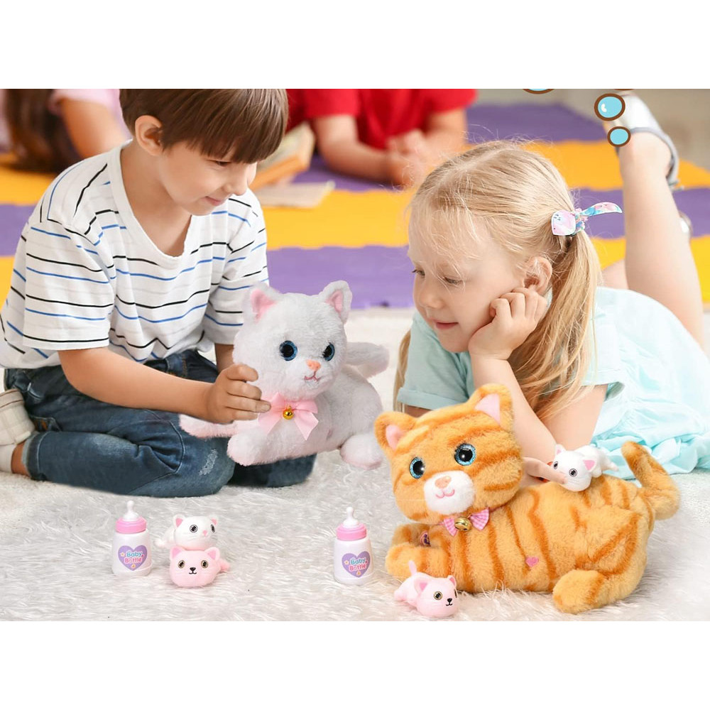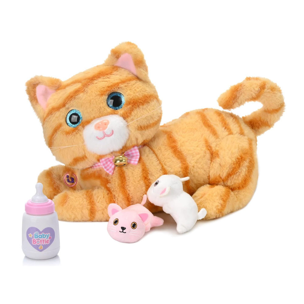 Egy gyönyörű interaktív cica minden olyan gyermek számára ajánlott, aki szeretne egy állatot gondozni. A tennivaló pedig bőven van, hiszen az anyamacska mellett két pici cica is található a készletben, akikről szintén gondoskodni kell. A bájos, vörös macska puha, kellemes tapintású plüssből készült. Gyönyörű csillogó kék szeme van és édes orra műanyagból. Az állatot rózsaszínű, levehető masni díszíti, arany haranggal. A játéknak számos funkciója van, amelyeknek köszönhetően sok órányi remek szórakozást nyújt, és biztosan nem fog gyorsan elfáradni. A macska mancsán van egy jegyzetgomb, amely a felvételért és a lejátszásért felelős. Nyomja meg az elsőt a felvételi mód elindításához, a másodikat a befejezéséhez, a harmadikat pedig a felvételünk lejátszásához. A felvételt csak egyszer tudjuk lejátszani. A másik mancson van egy gomb két szívvel, amelyek aktiválják a macska dühös nyávogását. Amikor finoman megsimogatjuk a cica hátát, dorombolást és nyávogást fogunk hallani. A hát simogatása aktiválja a betöltött dalokat ("Happy Birthday" és "If you happy and you now it" angolul) és a Twinkle Little Star dallamot is. Tejet adhatsz a cicának, az üveg behelyezése után az ivás hangját hallod. Miután a szívet a cica hasára helyezte, hallhatja a szopás és az ivás hangját. Egy plüss cica a gyermek legjobb barátja lehet. Szinte minden gyereknek van olyan időszaka, amikor úgy érzi, nagy szüksége van egy igazi házi kedvencre. De nehéz a gyerekeink minden kívánságát teljesíteni, főleg, ha ők igazi állatról álmodoznak, nekünk pedig nem lehet. Ezért, hogy vágyaikat részben vagy legalább részben teljesítsd, ajánljuk neked ezt az imádnivaló plüss cicát. Egy elbűvölő plüss cica minden szeretett házi kedvenc rajongót elragad majd. A készlet színes, esztétikus dobozba van csomagolva, ajándéknak is ideális.