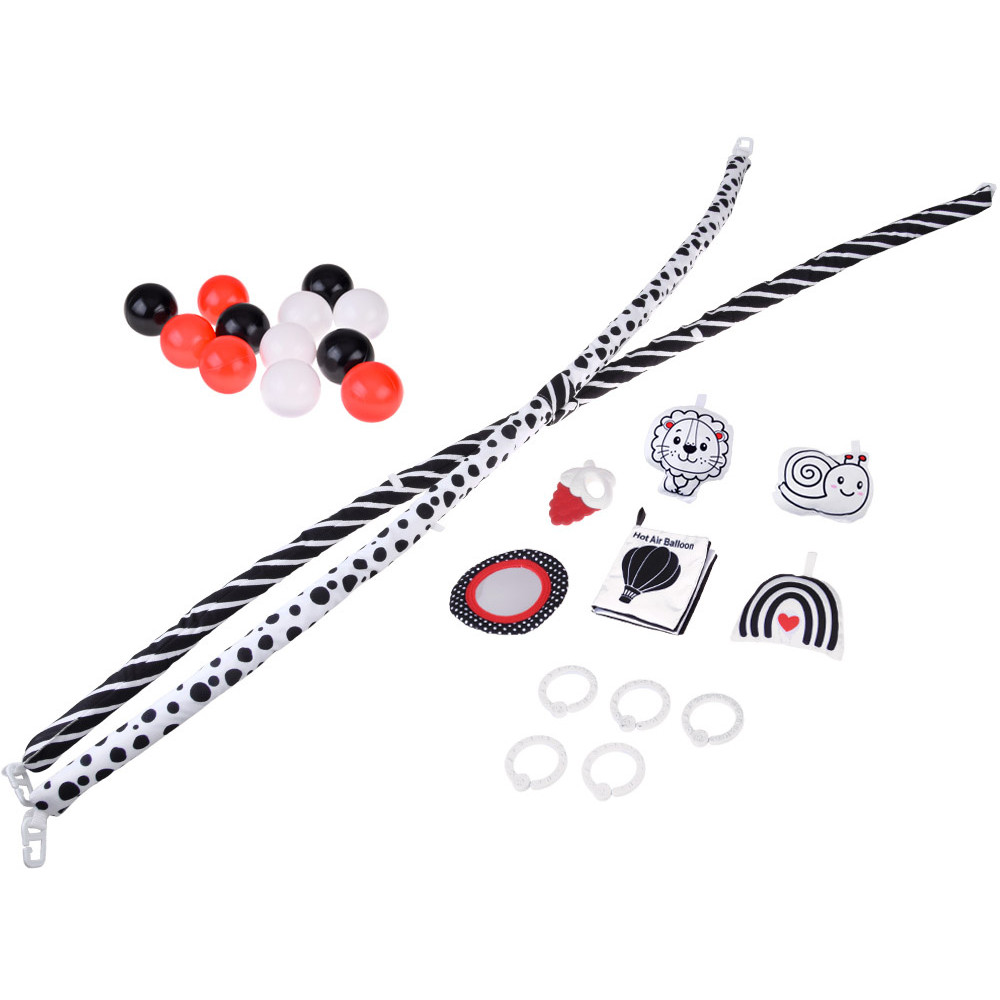 A függő játékok és figurák (kontrasztos könyv – 8 oldal, puha csiga, szivárványos csörgő rejtett csengővel, oroszlán síp, málna formájú rágóka, tükör) ösztönzik a babát a karok kinyújtására, a megfogásra és a mozgásra, ami segíti a szem-kéz koordináció és a finommotorika fejlődését. A játék tükör lehetővé teszi, hogy a babák lássák az arcokat, mozdulatokat és arckifejezéseket. Ez kiváló gyakorlat a koncentrációra és a mozgások követésére, amelyek kulcsfontosságú készségek a látás fejlődésében. A szőnyeg a gyermek növekedésével együtt „nő”. A szőnyeg, amelyet szövetből készült hálófal vesz körül, pillanatok alatt babakeretként is használható labdákkal.