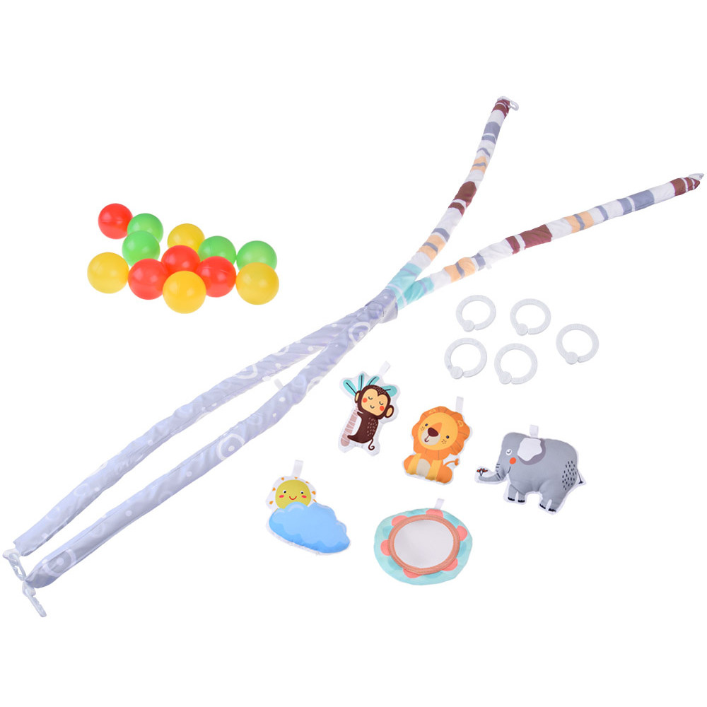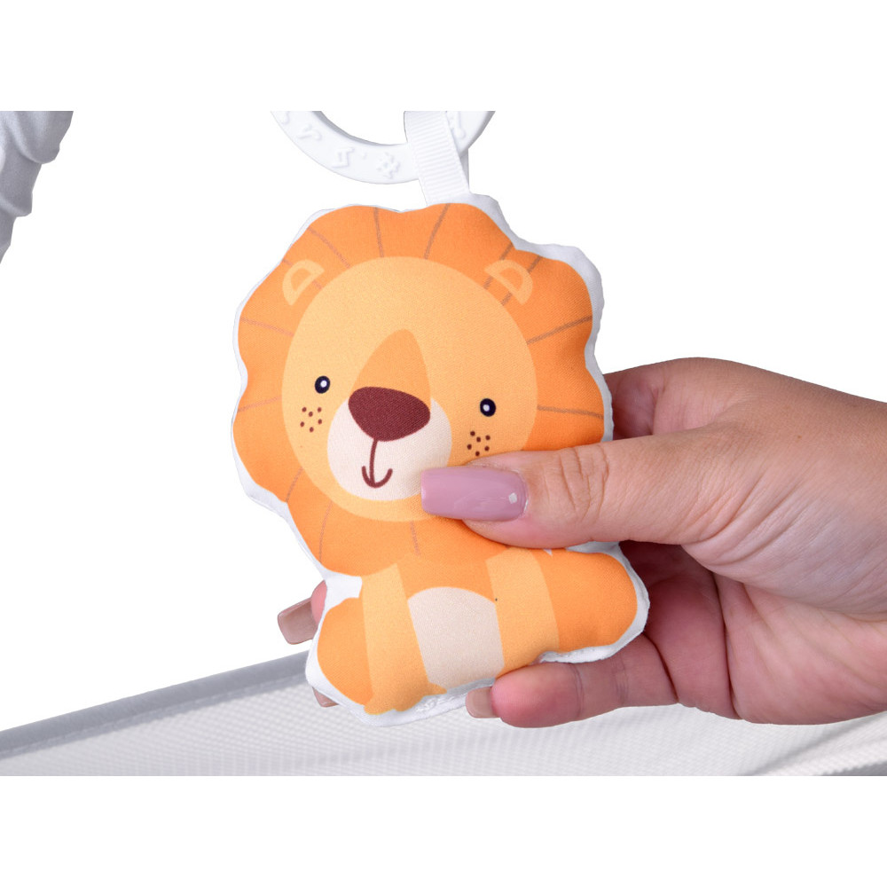 Két rugalmas ív könnyen levehető, ami megkönnyíti a szőnyeg mosását, tárolását vagy utazásra való előkészítését. Az íveken különböző függő játékok találhatók (tükör, nap felhővel, állatok: oroszlán, elefánt, majom), amelyek felkeltik a baba figyelmét, fejlesztik az érzékszerveit és ösztönzik a mozgást és aktivitást. A szőnyeg további előnye a hálós oldalfal, amely megakadályozza, hogy a labdák és játékok kicsússzanak a játszóterületről.