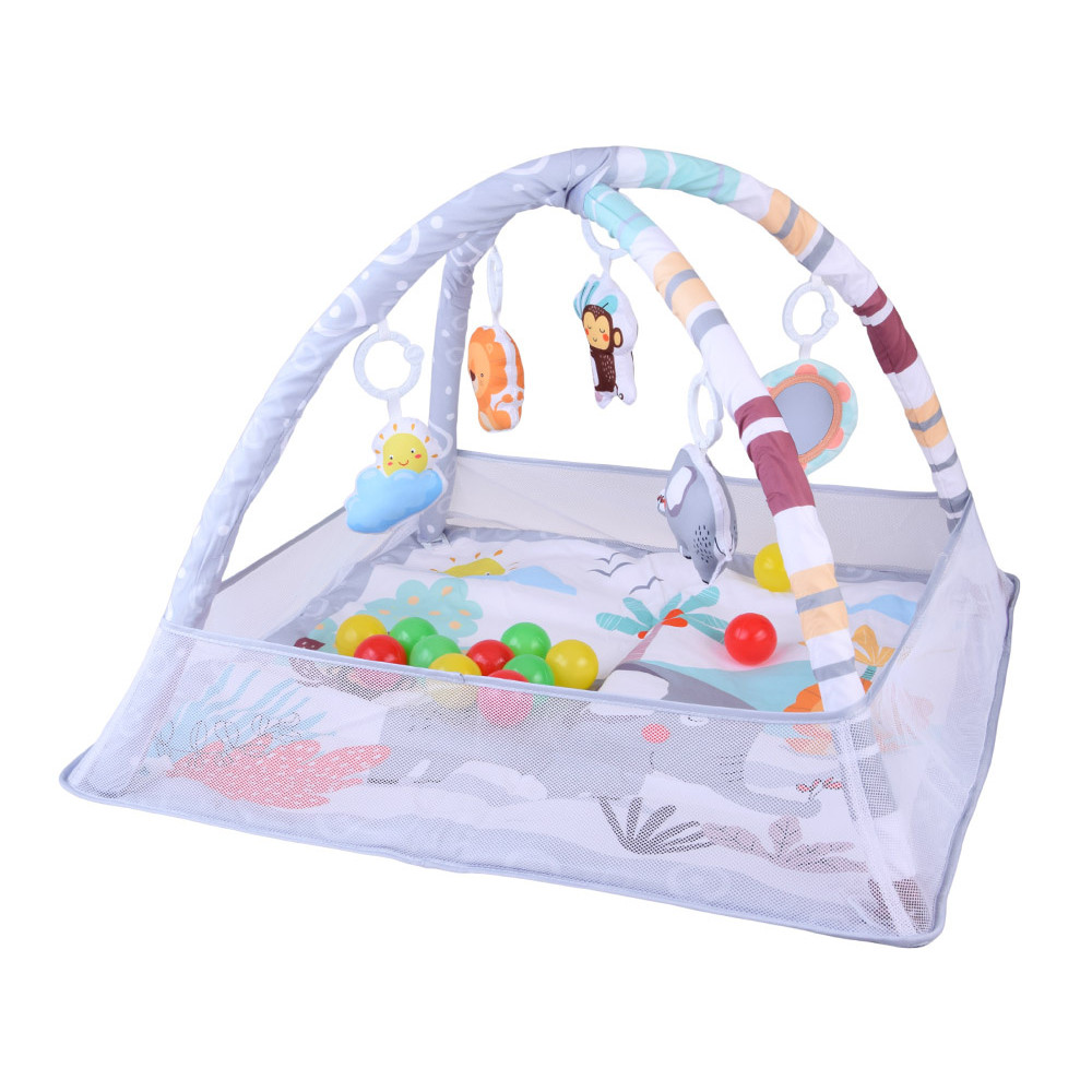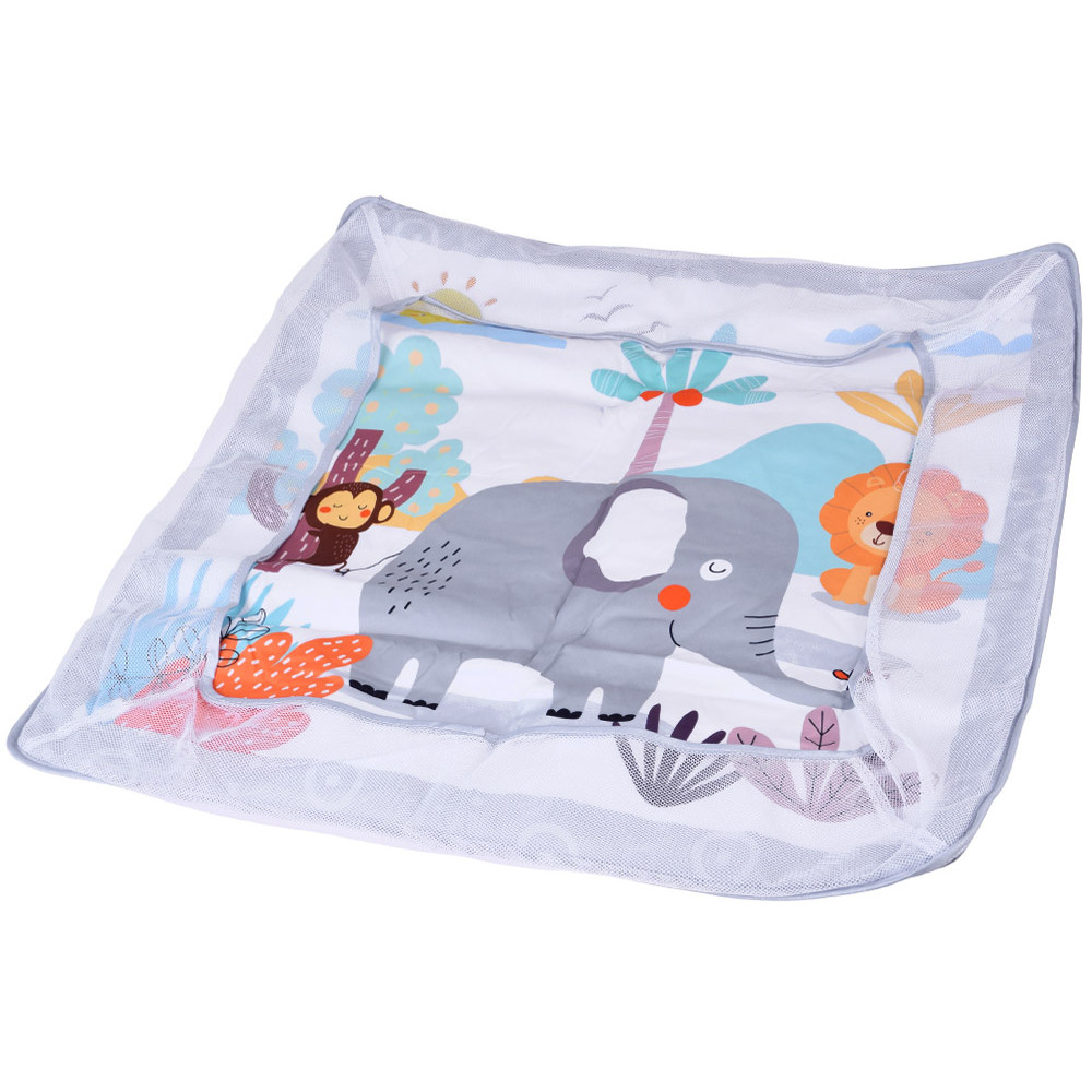 Ez az oktató játszószőnyeg babáknak ideális hely a kisbabád fejlődésének támogatására már az élet első pillanataitól. Négyzet alakú, pasztell színekkel, vidám állatfigurákkal és gondosan kiválasztott játékokkal készült, hogy serkentse a gyermek látását, hallását, tapintását és koncentrációját. A szőnyeg puha, kellemes tapintású anyagból készült, amely kényelmet biztosít és hatékonyan szigetel a kemény padlótól, így a kisbabád biztonságosan játszhat és pihenhet a nap bármely szakában.