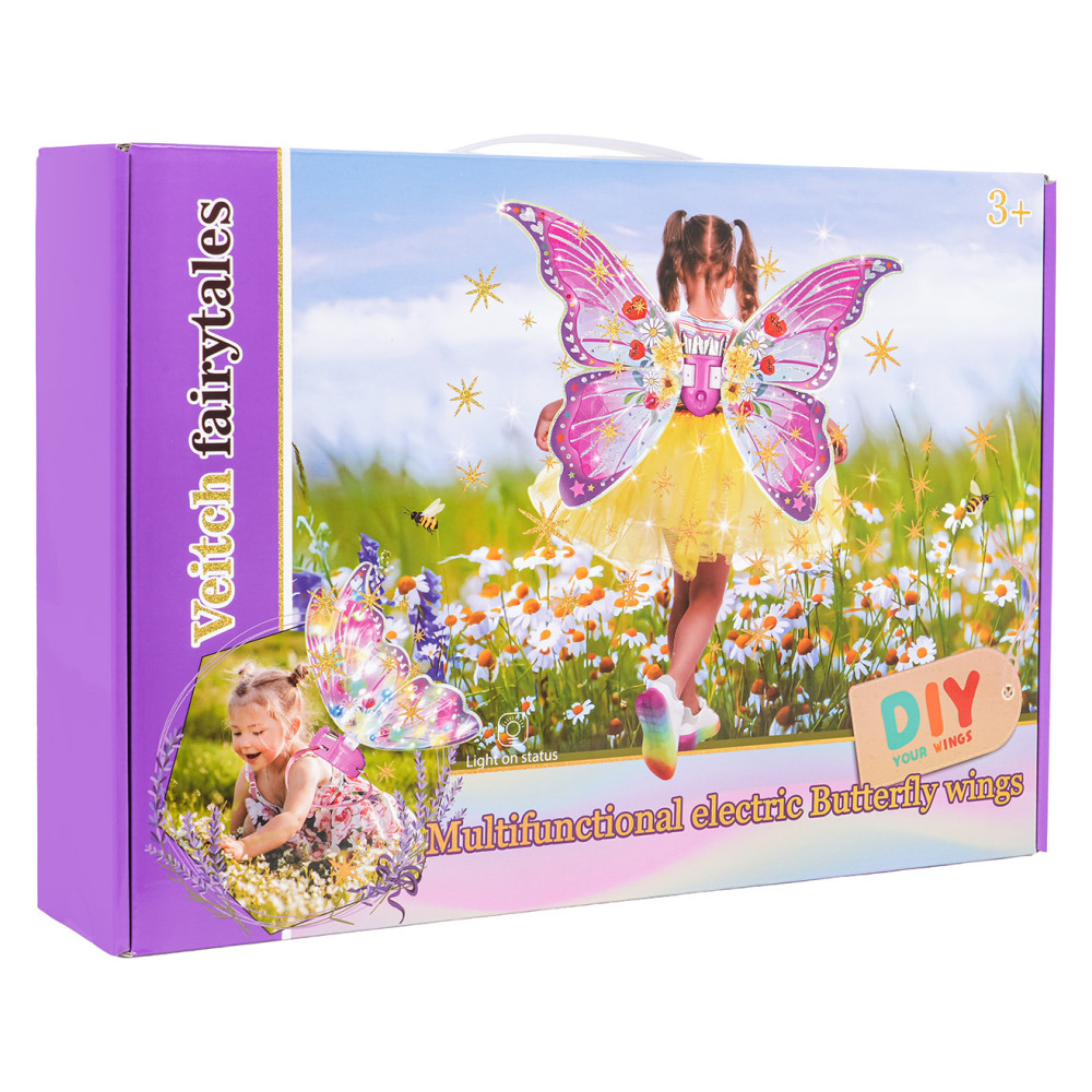 Ez a mesés készlet tartalmaz pillangószárnyakat, szoknyát, koronát és varázspálcát, és 3 éves kortól lévő gyermekek számára alkalmas. A készlet gondosan kidolgozott, és élénk színek széles skálájával büszkélkedhet. A játék elemmel működik.